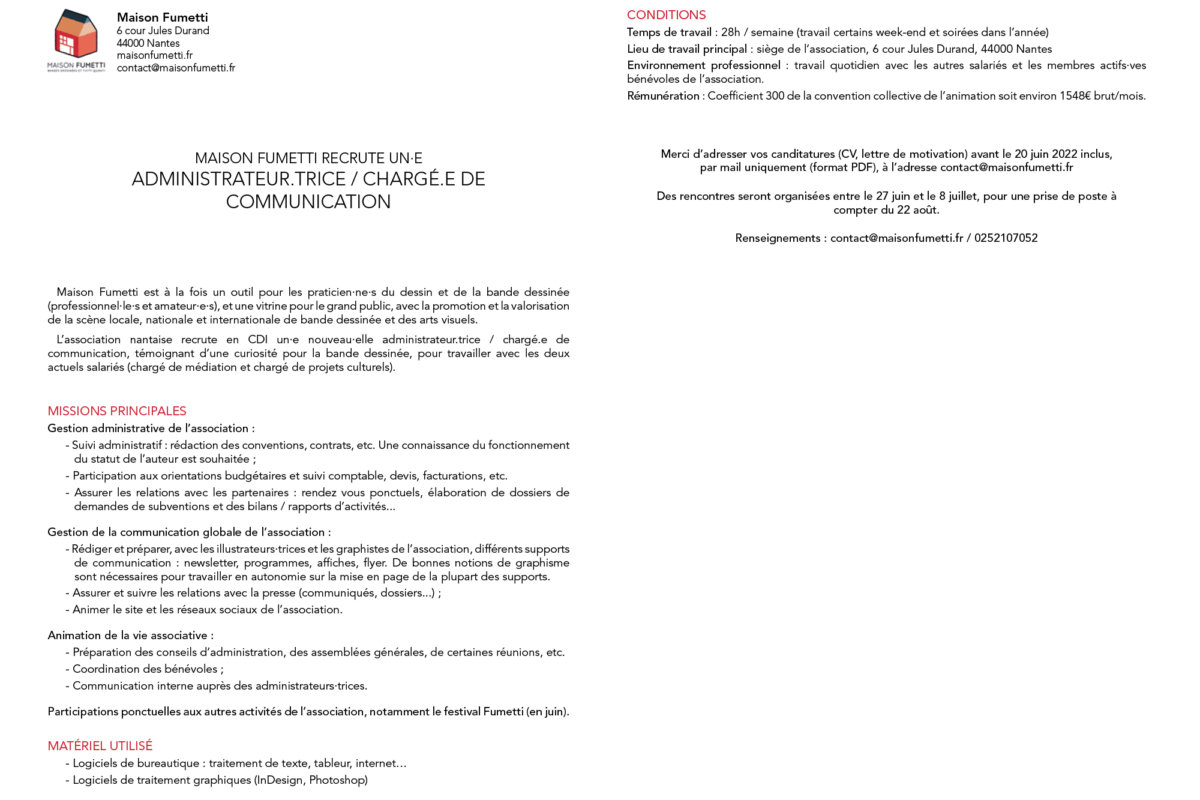Merci d’adresser vos candidatures (CV, lettre de motivation) avant le 20 juin 2022 inclus, par mail uniquement (format PDF), à l’adresse contact@maisonfumetti.fr.