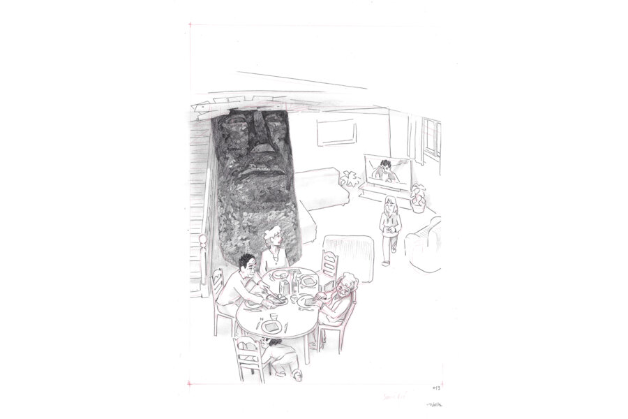 Après La cendre et le trognon (2019), où ses personnages portaient leurs bagages sociaux et intimes littéralement comme des bagages de toutes formes et tailles, il sort Les pierres de familles (2023), livre sur lequel se concentre cette exposition et qui nous parle d’un monde où les pères, les frères, les fils, les hommes, se transforment peu à peu en gigantesques statues. En Moaï.
