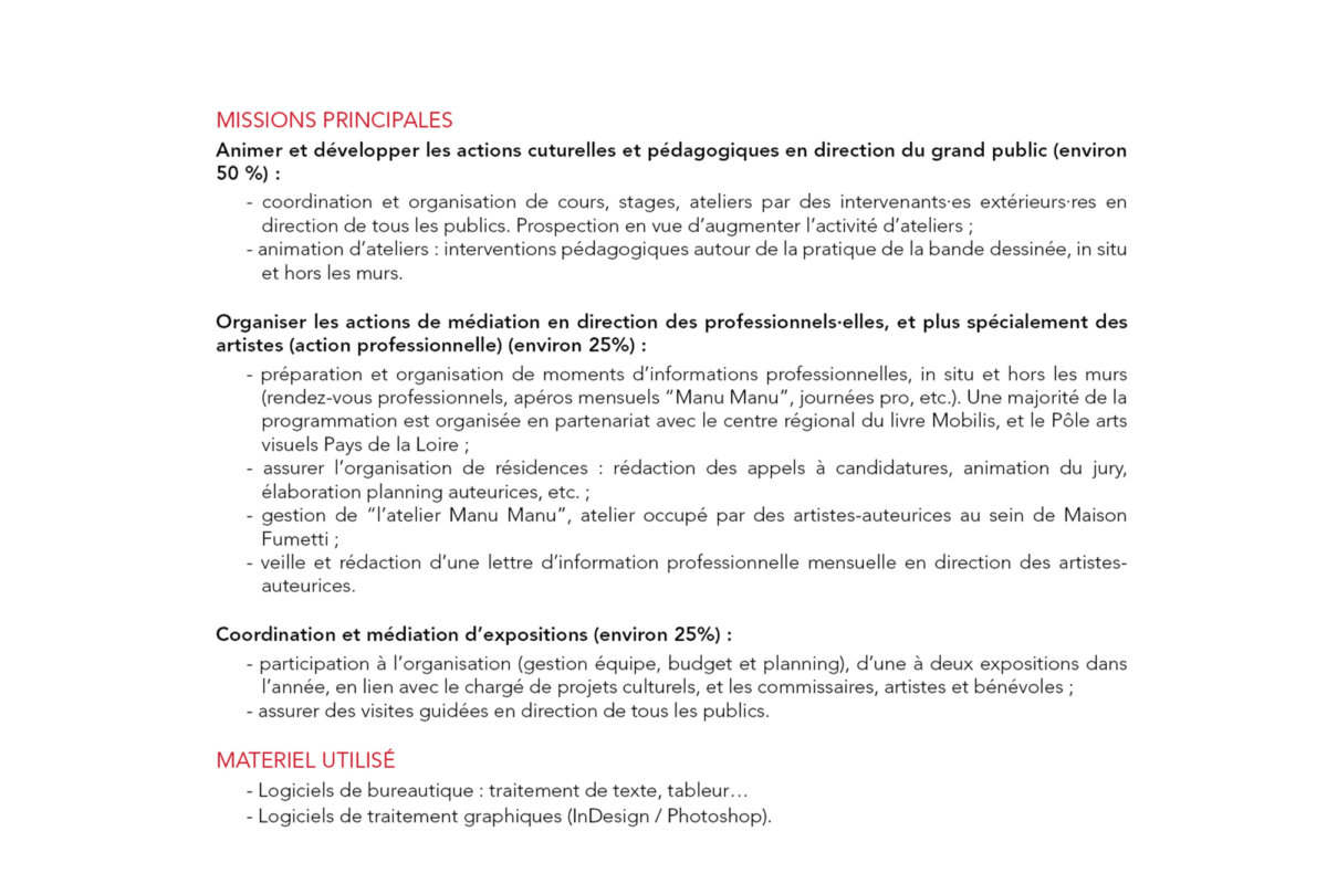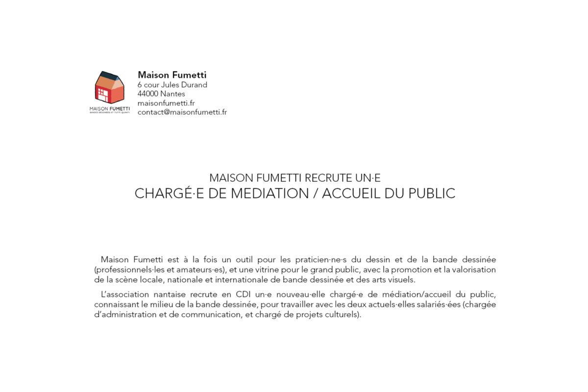 L’association recrute donc en CDI un·e chargé·e de médiation / accueil du public, témoignant d’une curiosité pour la bande dessinée, pour travailler avec les deux actuels salarié·es (Thomas, chargé de projets culturels, et Cassandre, chargée de communication).
